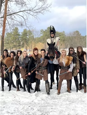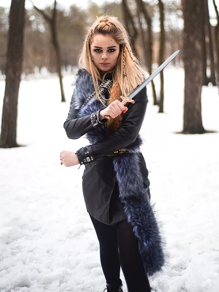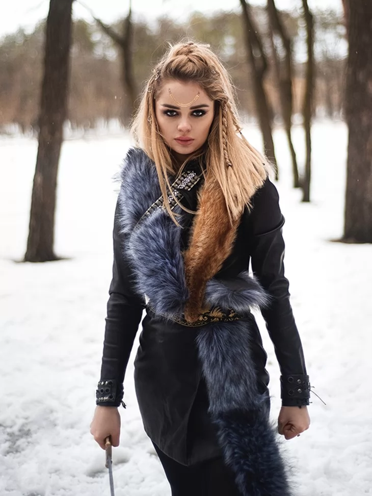 Цей ефектний образ амазонки виглядає сміливо, зухвало та дуже кінематографічно. Темна основа з хутряними акцентами створює враження войовничої героїні з північних легенд, а пасок з черепами додає характеру та сили. Ідеальний варіант для оренди карнавальних костюмів на тематичні вечірки, фотосесії та події, де хочеться бути головною героїнею вечора.