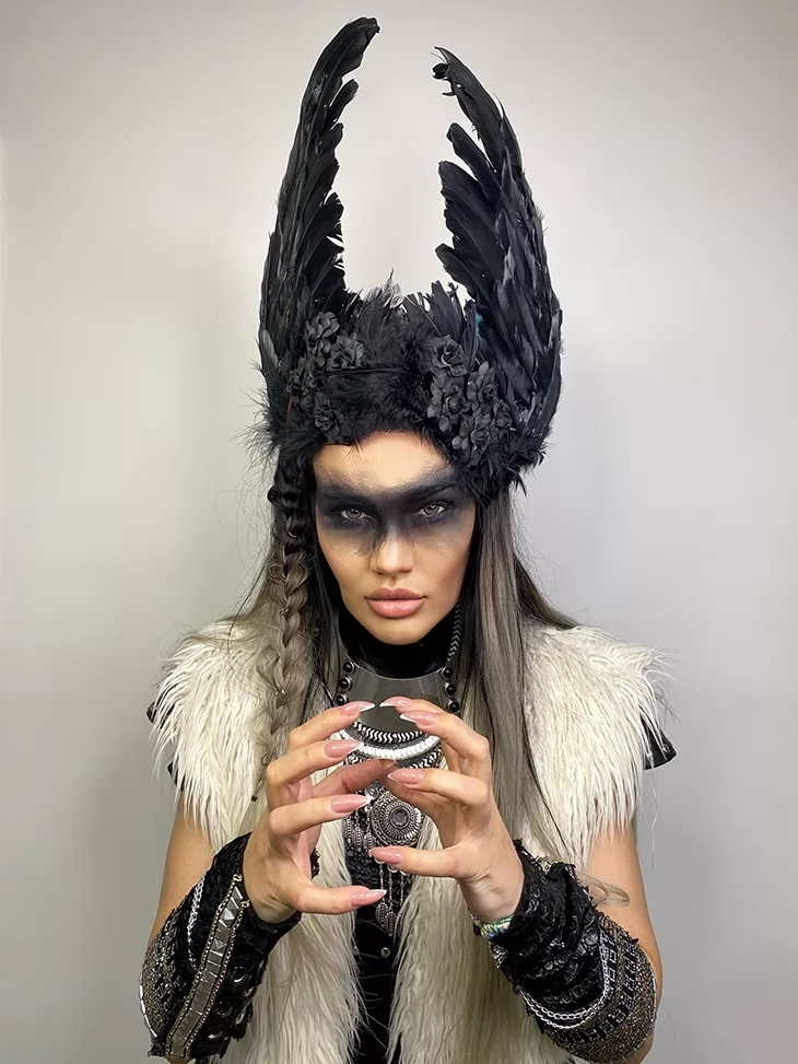– Ефектний головний убір із чорним пір’ям-крилами, що візуально витягує силует