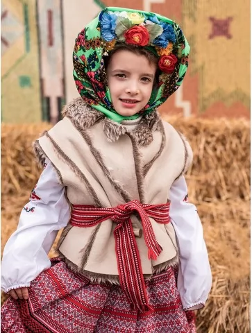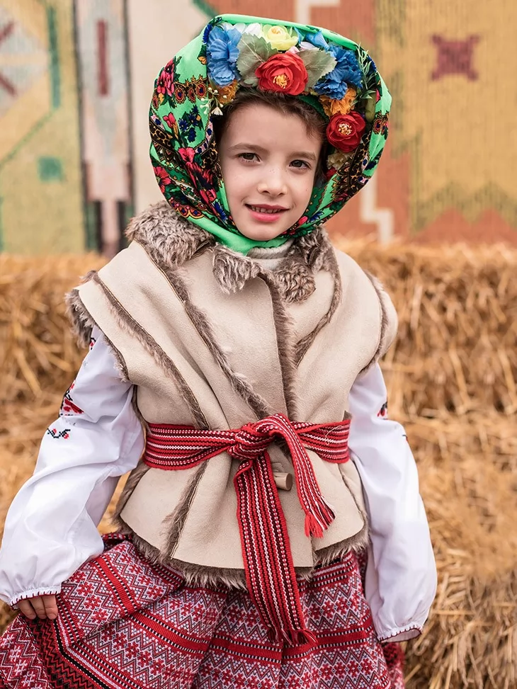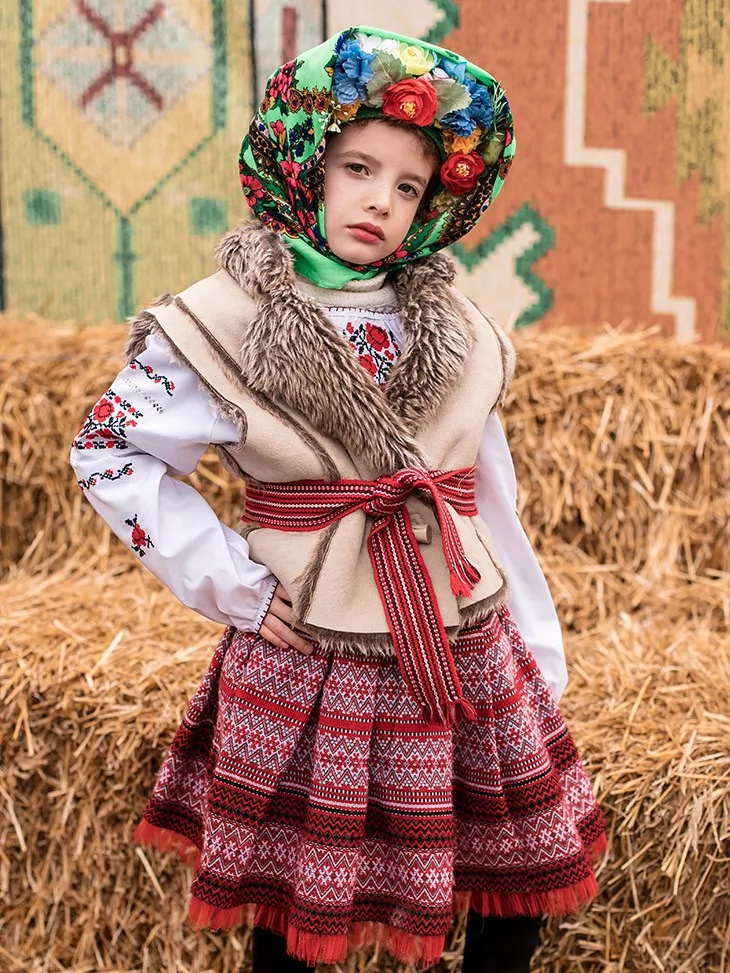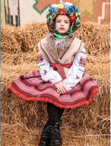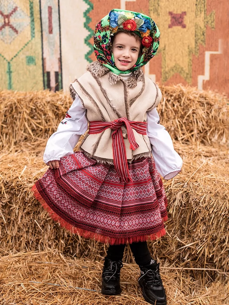 Теплий, по-домашньому затишний образ, що ніби зійшов зі старовинного народного ярмарку. Костюм передає атмосферу Масляної — солом’яні тюки, сміх, млинці й барвисті хороводи. Фактурна керсетка з хутряним оздобленням, орнаментована спідниця та яскрава хустка з квітами створюють живий і дуже фотогенічний образ. Це чудовий вибір для оренда карнавальних костюмів, коли потрібен автентичний народний стиль для дитини.