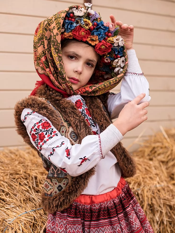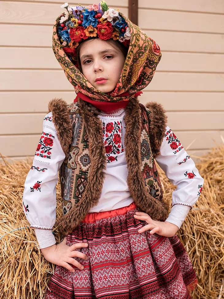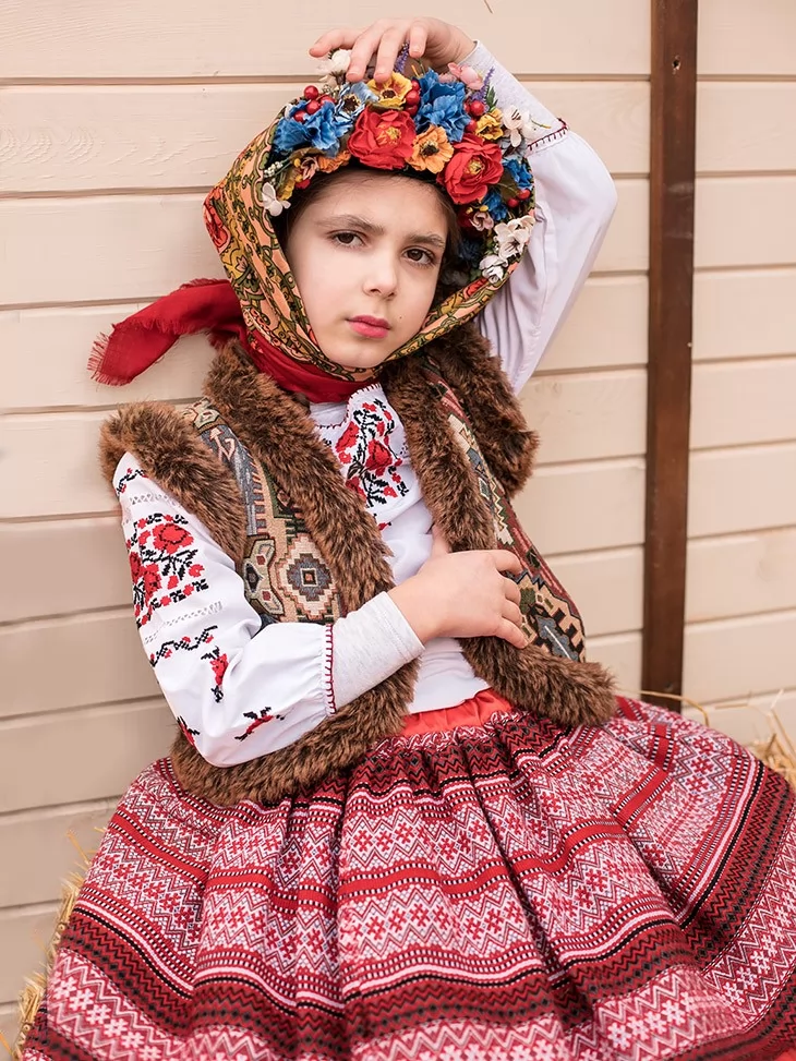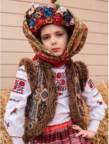 Образ із гірським характером і тихою силою традиції — стриманий, глибокий і дуже фотогенічний.Вишиванка з гуцульськими мотивами, фактурна керсетка з хутряним оздобленням і орнаментована спідниця створюють впізнаваний карпатський силует. Квітковий вінок і хустка додають м’якості та святкового настрою. Це вдалий вибір для оренда карнавальних костюмів, коли потрібна автентика без зайвої яскравості, але з характером.