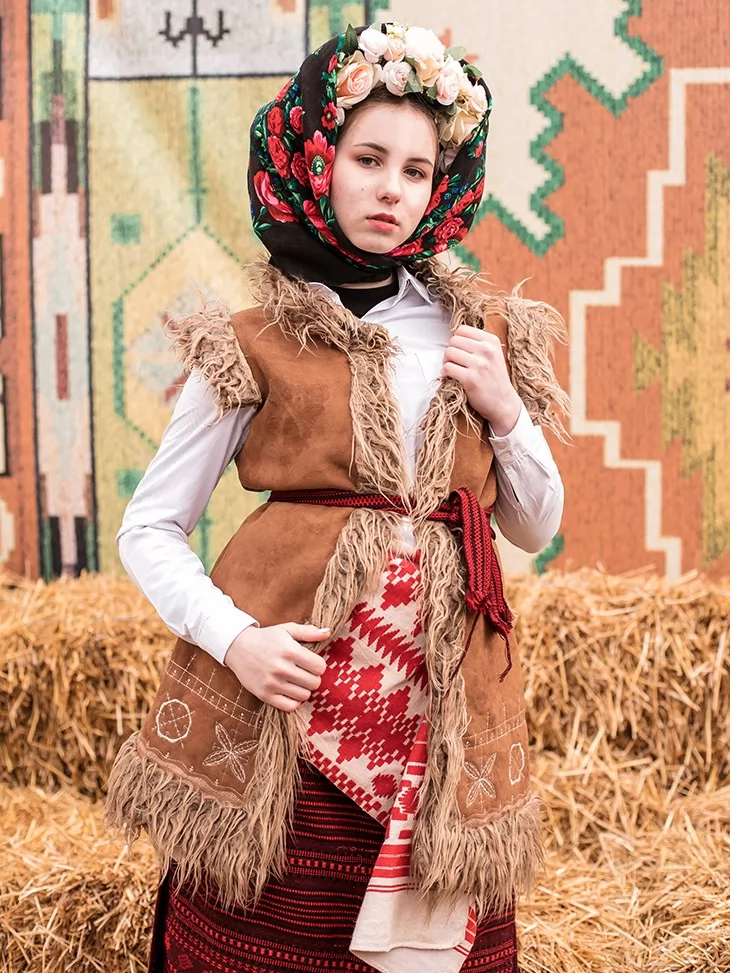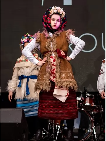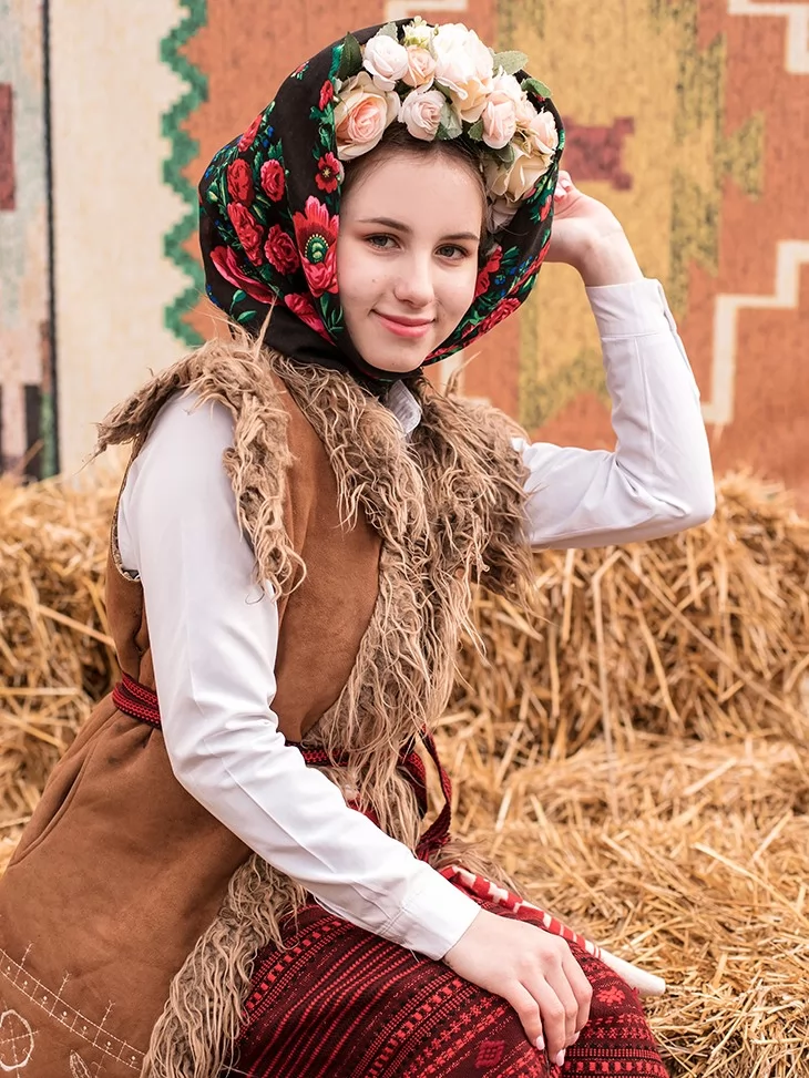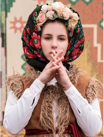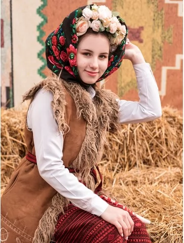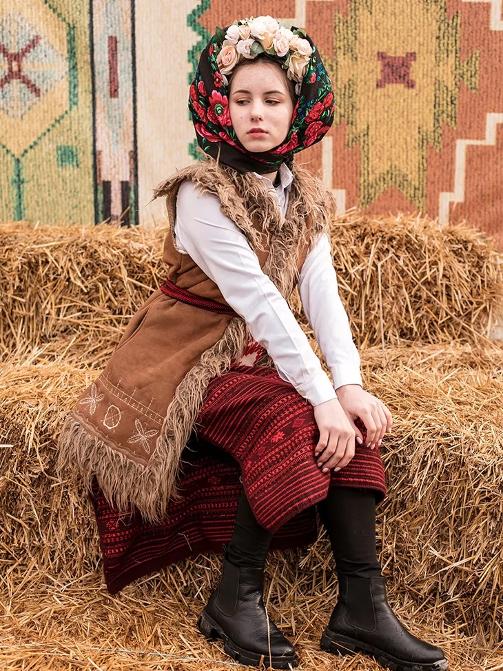 Сильний, виразний образ із характером, створений для сцени, великого простору та справжнього народного дійства. Цей костюм передає дух Масляної — гучної, яскравої, з піснями, хороводами й впевненими рухами. Керсетка з фактурною бахромою, стримана вишиванка та орнаментована спідниця формують чіткий силует, який чудово читається навіть здалеку. Образ виглядає серйозно, автентично й дуже ефектно — ідеальний вибір для оренда карнавальних костюмів на сценічні виступи.