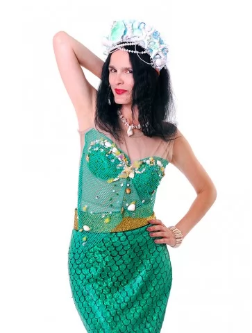 Цей спокусливий та магічний образ втілює красу підводного світу, таємничість океану й силу морської стихії. Насичений смарагдовий колір, фактура луски та витончені декоративні елементи створюють ефект справжньої русалки з морських легенд. Образ ідеально підходить для оренди карнавальних костюмів на фотосесії, шоу-програми та тематичні події.