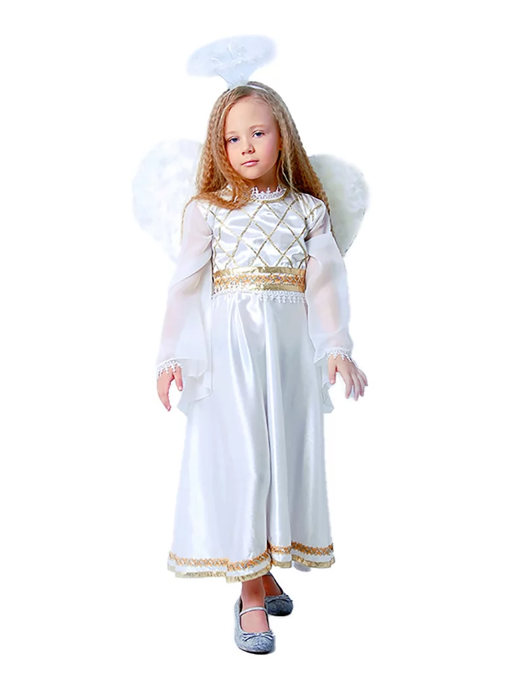 Світлий, чистий і по-справжньому урочистий образ, що випромінює спокій, тепло та різдвяну магію. Біла довга сукня з золотими акцентами виглядає ніжно та велично водночас. Прозорі рукави додають легкості, а крила й німб завершують образ небесного створіння. Це ідеальний вибір для святкових виступів та театралізованих дійств, коли потрібна особлива атмосфера добра. Оренда карнавальних костюмів дозволяє легко створити піднесений сценічний образ без зайвих турбот.